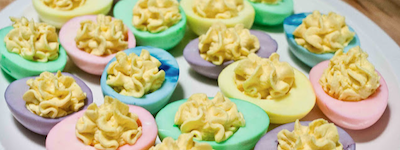 Think you’re ready for an Easter inspired twist on deviled eggs? Once boiled and peeled, halved and yoke removed, drop egg halves into cups of water with about three drops of your favorite easter food coloring shades and a teaspoon of cider vinegar. Allow the eggs to soak just like when you’re dying the shells and allow them to dry on a paper towel before filling with your favorite deviled egg mixture. This springy version of a classic Easter food will be a fast favorite, especially if you have children!