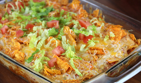 - Add top layer of corn chips or corn tortillas